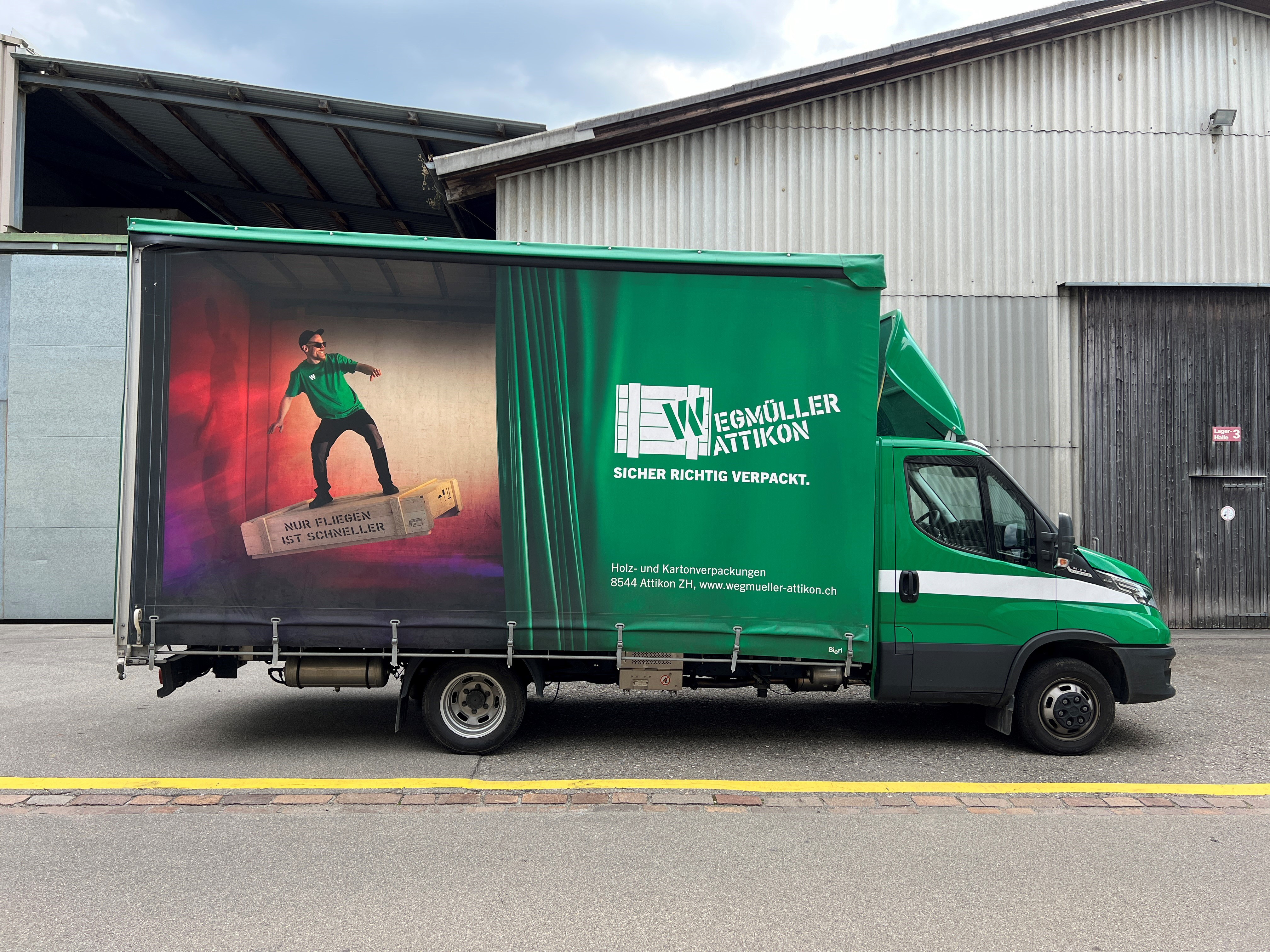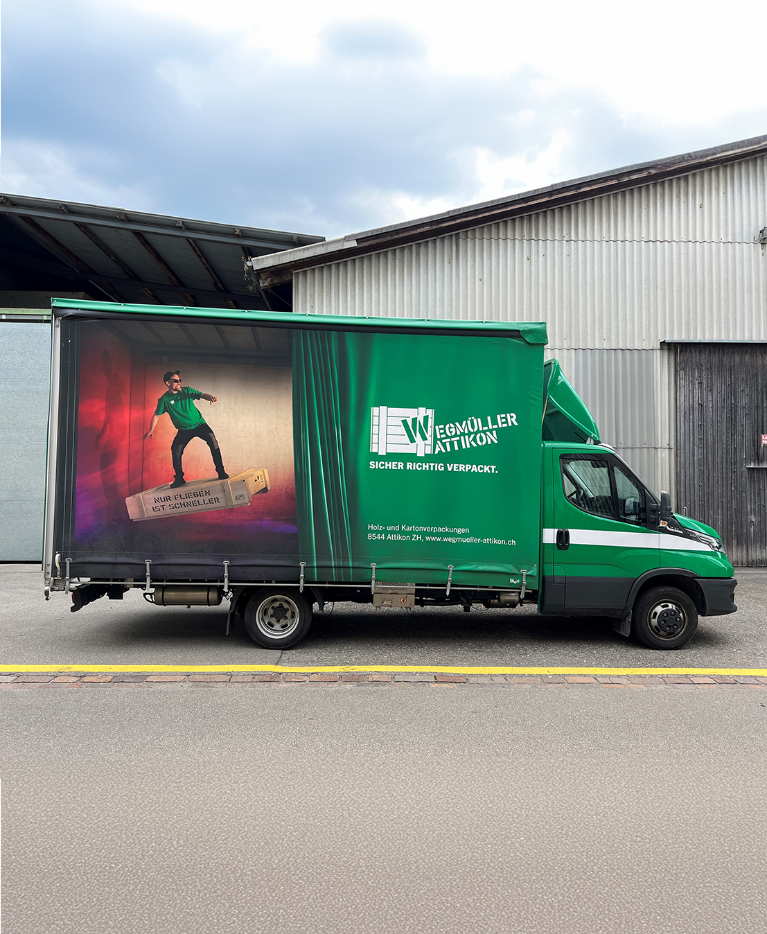 Diesen kreativen, herausfordernden und wunderschönen Auftrag durfte ich vom Ideen-Brainstorming, über das Fotoshooting mit Nebelmaschine und fliegender Kiste, bis zum fertigen Layout der zwei neuen Lastwagenblachen realisieren. Ein tolles Projekt mit einem tollen Team! Danke an alle Beteiligten, die das Projekt «zum Fliegen» gebracht haben.